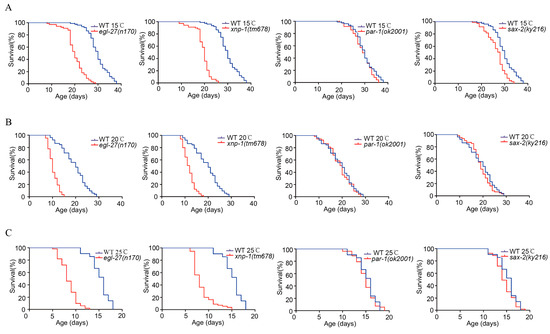 Temperature-responsive phosphoproteins are essential modulators of the worm lifespan. (A) The lifespans of egl-27 and xnp-1 mutants were significantly reduced at 15 °C (p < 0.01, log-rank test). The lifespans of sax2 and par-1 mutants were not reduced at 15 °C (p > 0.05, log-rank test). (B) The lifespans of egl-27 and xnp-1 mutants were significantly reduced at 20 °C (p < 0.01, log-rank test). The lifespans of sax2 and par-1 mutants were not reduced at 20 °C (p > 0.05, log-rank test). (C) The lifespans of egl-27 and xnp-1 mutants were significantly reduced at 25 °C (p < 0.01, log-rank test). The sax2 and par-1 mutants were not significantly reduced at 25 °C (p > 0.05, log-rank test).