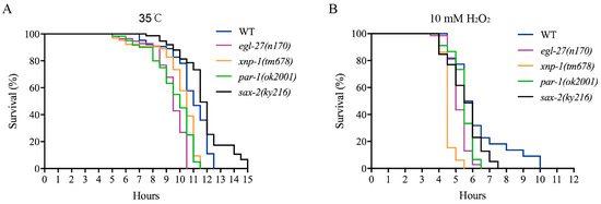 Lifespan extension has a certain correlation with resistance to different stresses, e.g.; thermal and oxidative stresses [49,50]. Survival curve analysis is typically used to evaluate the impacts of various stresses on organisms. Under thermal stress (35 °C) or hydrogen peroxide induced oxidative stress, the survival curves of EGL-27, XNP-1, and PAR-1 mutants were found to be shorter than those of wild-type strains (p < 0.01) but not that of SAX-2 mutants (Figure 8A,B). Taken together, EGL-27, XNP-1, and PAR-1 confer resistance to various stresses, improving survival rates.