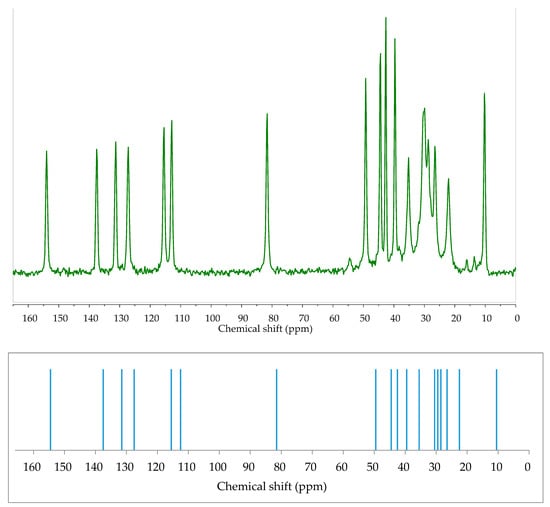 Experimental (top, green) Cross Polarization Magic Angle Spinning (CP MAS) and calculated (bottom, blue) GIPAW 13C solid-state NMR spectra of E2. Very good agreement between calculated and experimental values proves the usefulness of DFT calculations in solid-state analysis of estrogens. More details in [158]. Source: Author’s archive.