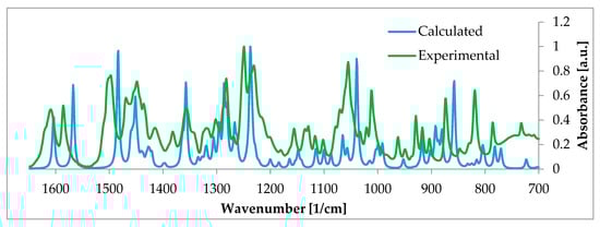Experimental (green) and calculated (blue) IR spectra of β-estradiol hemihydrate, selected range 700–1650 cm−1. Such calculations enable proper band assignments and thus facilitate the spectrum analysis. More information can be found in [158]. Source: Author’s archive.