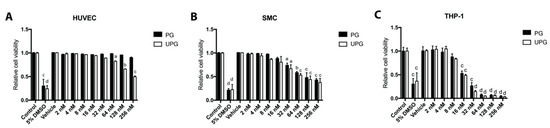 2.1. Effect of PG or UPG on Viability and Cell Cycle of HUVEC (Human Umbilical Vascular Endothelial Cell), SMC and THP-1 Derived Macrophage-Like Cells