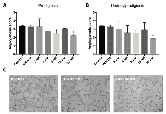 Tube formation of HUVECs using Matrigel basement membrane matrix. Different concentrations of PG or UPG were evaluated in the presence of 10 ng/mL VEGFA for 6 h at 37 °C in CO2 atmosphere. Graphical representation of tube formation for prodigiosin (A) and undecylprodigiosin (B). The angiogenesis score (scale without unit) was calculated considering the number of sprouting cells, connected cells and polygons, and the complexity of the formed mesh. Data are expressed as mean ± SD. a, p < 0.05; ANOVA with Dunnett’s post hoc test. (C) Representative photographs after 6-h treatment with 32 nM prodigiosin and 32 nM undecylprodigiosin. The results were confirmed in three independent experiments (3 replicates per experiment).