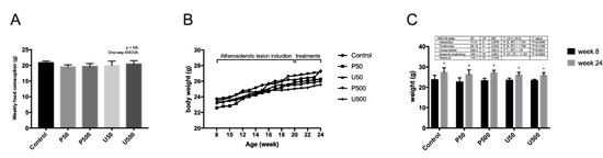 In the next 12 weeks, the animals were fed a 0.5% cholesterol-enriched hypercholesterolemic diet (HCD) and were monitored using an animal surveillance protocol [57], which allowed us to calculate a score by assessing appearance, water and food intake, weight loss, temperature, respiratory/cardiac frequency and behavior. When an alteration of the state of health or signs of suffering were observed, the animal was excluded from the study. In this regard, one animal presented an impaired state of health, so it was euthanized by carbon dioxide. At week 12 (20 week old mice), the mice were randomly divided into five experimental groups (n = 15) using GraphPad QuickCalcs Website [58]. Thus, each experimental group received the HCD plus a daily dose of a specific treatment: vehicle (0.9% NaCl, 0.25% Tween 80, 20% polyethylene glycol; control group); 50 µg/Kg/day PG (P50); 500 µg/Kg/day PG (P500); 50 µg/Kg/day UPG (U50); or 500 µg/Kg/day UPG (U500). The vehicle or treatments were administered by gavage for 28 days.
