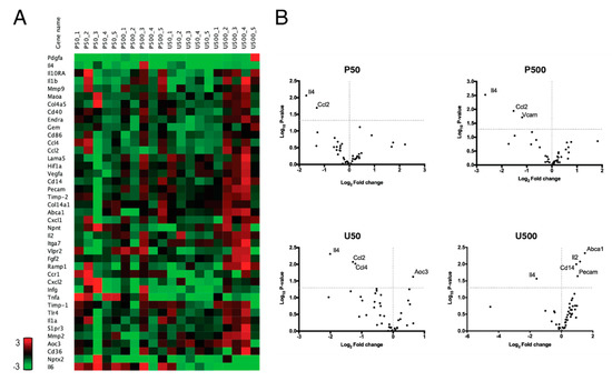 The expression of a set of genes, including genes associated with inflammatory processes and plaque stability, was assessed by real time PCR. The set of evaluated genes did not show major differences among the different groups (Figure 7A); however, the U500 mice group showed an increased expression of the majority of the evaluated genes, in comparison to the other groups. Volcano plots (Figure 7B) summarized the differential expression of the evaluated genes, with statistically significant differences. All doses of PG and UPG were able to significantly repress the gene expression of Il-4. In addition, in the P50, P500 and U50 groups, the expression of chemokine (C-C motif) ligand 2 (Ccl2) was slightly repressed. Furthermore, vascular cell adhesion molecule 1 (Vcam-1) had a slight decrease in group P500, while the U50 group showed a slight decrease in the expression of Ccl4 and an increased expression of amine oxidase, copper containing 3 (Aoc3). Finally, expression of platelet endothelial cell adhesion molecule (Pecam-1), Cd14, Il-2 and ATP-binding cassette transporter A (Abca1) was increased in the U500 group.