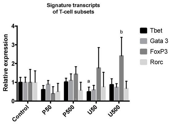 In order to obtain a complementary measurement about the activation of T cells in lymphoid tissues that interact with the aortic tissue, the signature transcripts of different Th cell subsets in paraaortic lymph nodes were assessed by RT-PCR analysis of mRNA (Figure 8). No changes were observed in the expression of transcription factors Gata3 (Th-2 marker) and Rorc (Th-17 marker). By contrast, T-bet (Th-1 marker) expression was attenuated in the U50 group. In addition, Foxp3 (Treg marker) expression was overexpressed in the U500 group.