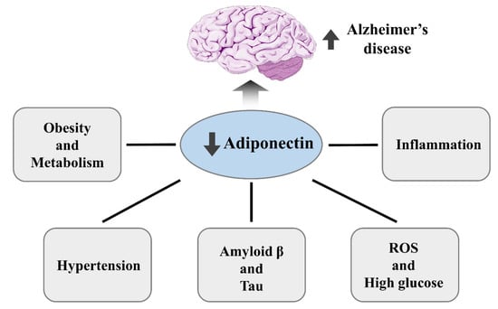 Adiponectin secreted from the adipose tissue sensitizes the insulin receptor signaling pathway and prevents inflammation. Adiponectin is a protein that modulates a number of metabolic diseases (Figure 1), including diabetes, dyslipidemia, atherosclerosis, and comorbid metabolic dysfunction that occur in cardiovascular diseases such as hypertension. Many studies have indicated that alteration levels of adiponectin in the plasma and cerebrospinal fluid (CSF) correspond to a distinctive condition of mild cognitive impairment (MCI) and AD [8,9,10,11,12,13]. The reason for the discrepancies among these studies is unclear, but adiponectin may be considered to be a metabolic biomarker for AD.