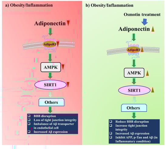 Osmotin treatment positively modulates AD through the AdipoR1/AMPK/SIRT1 pathway. (a) Obesity reduces adiponectin and AdipoR1 expressions, which negatively modulate the AMPK/SIRT1 pathway and increase the AD biomarkers. (b) Osmotin treatment increases adiponectin and AdipoR1 expressions and reduces AD biomarkers through the AMPK/SIRT1 pathway.