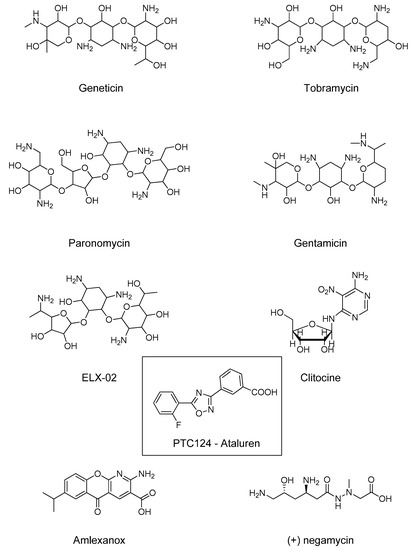 The first drugs tested as translational readthrough-inducing drugs (TRIDs) were aminoglycosides (e.g., gentamicin, tobramycin, paromomycin, geneticin; see Figure 3), which have been shown to suppress the normal proof-reading function of the ribosome [40,41]. These drugs, which were already known for their antibiotic activity, induce the readthrough of the PTCs continuing the translation process [42]. Unfortunately, the chronic use of high dosages of aminoglycosides is associated with severe side-effects such as renal, auditory, and vestibular toxicities [43], which is what inhibited their pharmaceutical implementation. Nevertheless, a new aminoglycoside, showing potential activity as a TRID and reduced toxicity, has been tested in healthy subjects and is currently proceeding further in clinical trials [44].