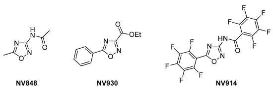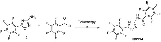 2,3,4,5,6-Pentafluoro-N-(5-(perfluorophenyl)-1,2,4-oxadiazol-3-yl)benzamide (NV914) was prepared by acylation of the amine 2 [60,61,62] with perfluorobenzoyl chloride, as reported in Scheme 2.