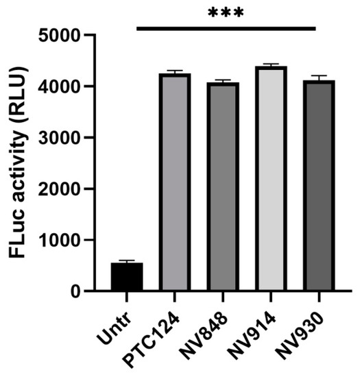 The newly synthesized molecules show readthrough activity in the FLuc cell model system. Histogram shows luciferase (FLuc) activity (RLU) after 24 h of exposition to PTC124, NV848, NV930, and NV914 (all at the concentration of 12 μM) in HeLa FLuc-opal transfected cells. Data were analyzed by GraphPad Prism 6 software and expressed as mean values ± standard error of the mean (SEM; n = 3). Symbol (*) represents the statistical significance of data regarding PTC124, NV848, NV914, and NV930 versus Untr: ***, p < 0.001 (ANOVA with Dunnett’s posthoc test).