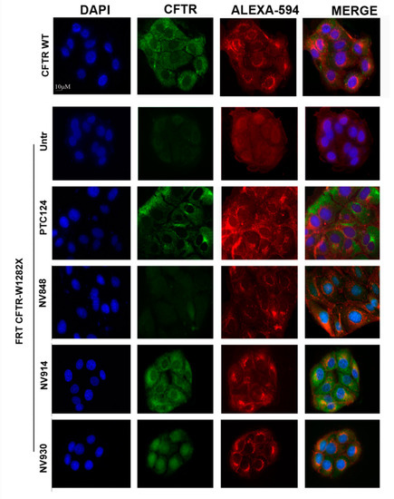 Immunofluorescence analysis of the full-length CFTR protein in wild-type (CFTR-WT) and CFTRW1282X FRT cells, untreated (Untr) or treated with 12 μM PTC124, NV848, NV930, or NV914 for 24 h. CFTR protein was revealed by a specific antibody (ab570-green). Nuclei (blue) were DAPI-stained and the cellular membrane was stained by WGA-Alexa 594 (red).
