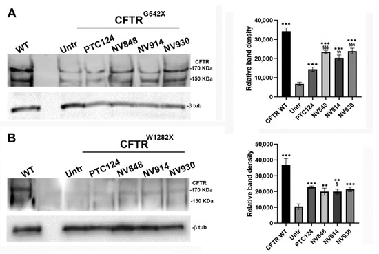 Western blot analysis of the CFTR protein in wild-type (WT) CFTR, and CFTRG542X (A) and CFTRW1282X (B) FRT cells, untreated (Untr) or treated with 12 μM PTC124 (positive control), NV848, NV930, or NV914 for 24 h; β-tubulin was used as control for the protein loading. The graphs show the quantification of the gel bands by ImageJ software. The experiment was performed in triplicate and data were normalized by β-tubulin expression, analyzed by GraphPad Prism 6 software. Data are expressed as mean values ± standard error of the mean (SEM). Symbols (* and §) represent the statistical significance of NV848, NV914, and NV930 versus Untr (*) and versus PTC124 (§). two symbols, p < 0.01; three symbols, p < 0.001 (Student’s t-test and ANOVA with Dunnett’s posthoc test).