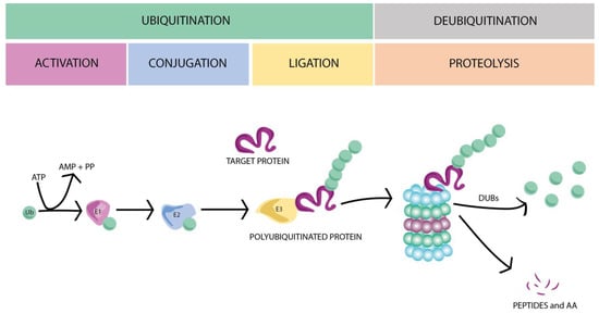 UPS controls and assists the protein degradation process. The ligation of ubiquitin molecules to targeted proteins plays a crucial role in specific protein degradation, and therefore in its turnover. A cascade of catalytic reactions involves three main groups of enzymes that perform the protein ubiquitination, tagging, and driving to the proteasome to be subsequently degraded: E1 (ubiquitin-activating enzyme), E2 (ubiquitin-conjugating enzyme), and E3 (ubiquitin–protein ligase), respectively (for review see [14,17,19,20]). Briefly, E1 enzymes activate ubiquitin, generating an ATP-dependent chemical bond between the C-terminal glycine (G76) to the cysteine of ubiquitin, producing a high-energy thioester intermediate. Next, E2 ubiquitin-conjugating enzymes take the activated ubiquitin and transfer it to the target substrate by an E3 ubiquitin ligase (Figure 1).