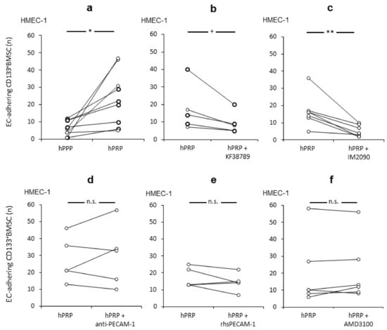 P-selectin/PSGL-1 dependent platelet interactions with CD133+BMSC promote adhesion to human micro-EC under shear stress. Adherence of CD133+BMSC to human micro endothelial cells (HMEC-1) co-incubated with human platelet rich plasma (hPRP) was tested by pairs under different conditions: control and treatment at a time. (a) Increased CD133+BMSC adherence with hPRP when compared to platelet poor plasma (hPPP). (b,c) Both Pre-incubation of platelets with P-selectin-inhibitor KF38789 and CD133+BMSC with PSGL-1 antagonist IM2090 revealed a reduction of adherence of CD133+ BMSC. (d–f): Co-incubation with PECAM-1-blocking antibody mPECAM-1.3 IgG (anti-PECAM-1), recombinant soluble human PECAM-1 (rhsPECAM-1) and CXCR4-inhibitor for SDF-1 interaction AMD3100 respectively lacked a modulating effect on CD133+BMSC for adherence to HMEC-1. Paired t-test: * p < 0.05; ** p < 0.01; + p = 0.067; n.s. p > 0.1.