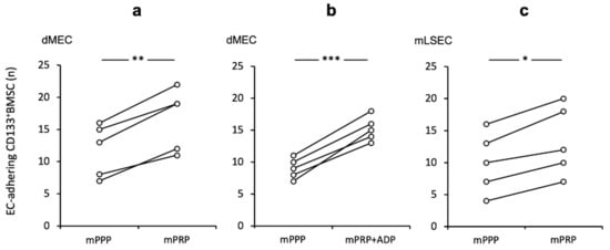 Augmented CD133+BMSC adherence to endothelium subsequent to platelet co-incubation in a murine shear-stress model Adherence of CD133+BMSC to murine endothelial cells co-incubated with mouse platelet rich plasma (mPRP) was tested by pairs under different conditions: control and treatment at a time. (a) Significant increase in adhering mouse CD133+BMSC to mouse dermal micro-endothelial cells (dMEC) with mPRP when contrasted to mPPP (mouse platelet poor plasma). (b) Platelet activation by ADP did not further enhance the mPRP effect. (c) Augmenting platelet effect on mCD133+BMSC adhesion to mLSEC. Experiments were performed at shear levels of 1.0 dyne/cm2 followed by quantification of adherent CD133+BMSC in % of mPPP control conditions. Paired t-test: * p < 0.05; ** p < 0.01; *** p < 0.001.