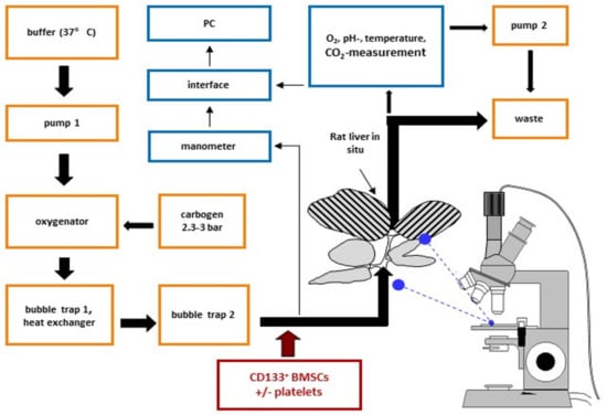 We established a single pass, xenogeneic in situ IPRL model-system in combination with video-assisted in situ imaging to evaluate an impact of platelets for homing of CD133+BMSC to the liver following warm ischemia ex vivo (Figure 3). A serum-free single pass xeno-perfusion model of human platelets and BMSC, respectively transfused to the rat liver was selected to test human blood-born components with the liver micro architecture, as a test system incorporating human liver is not available at present. In this system, human primary CD133+BMSC, human platelet rich plasma (PRP) and platelet poor plasma (PPP) were prepared from the same donors. Rat livers of male Wistar rats (120–160 g) were linked to an isolated perfused rat liver model (IPRL). We performed portal vein cannulation of the rat liver left in situ and secured hepatic venous flow via cannulation of the vena cava superior. Additional cannulation of the ductus choledochus allowed drainage of bile. After stable flow was established with Krebs–Henseleit Buffer at 37 °C at a flow rate of 250 µL/min a warm hepatic ischemia was achieved by pausing the hepatic flow for 30 min. The ischemic phase was followed by a reperfusion period of 3 h length. Hereafter, 2 × 10E5 human CD133+BMSC were infused as a bolus to the liver perfusing portal venous flow.
