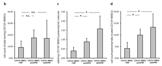 Platelets increase CD133+BMSC binding and extravasation in an ischemia and reperfusion injury model. CD133+BMSC were infused to the rat liver after 180 min of reperfusion. In Situ Imaging by fluorescence microscopy of 10 different visual fields. (a) In situ Imaging: Extra-sinusoidal (parenchymatous, red circle) vs. sinusoidal (intra-vascular, black circle) CD133+BMSC after liver passage. Membranes of CD133+BMSC were labeled prior to in situ perfusion with PKH67 Green to analyze amount and localization of human BMSC homing to the rat liver by fluorescence microscopy of at least 10 different visual fields. (b) IPRL: Increase of absolute numbers of CD133+BMSC homing to the liver (CD133+BMSC cell count per 10 visual fields) without platelet co-treatment (column 1; -PRP) versus CD133+BMSC pre-infusion of PRP and subsequent infusion of stem cells to the rat liver (column 2; postPRP) versus CD133+BMSC co-incubated with PRP and subsequent co-infusion (column 3; withPRP). (c) Relation of parenchymal versus vascular located CD133+BMSC in these 3 groups. (d) Absolute numbers of CD133+BMSC located to the extra-sinusoidal parenchyma. * p < 0.05; n.s., not significant.