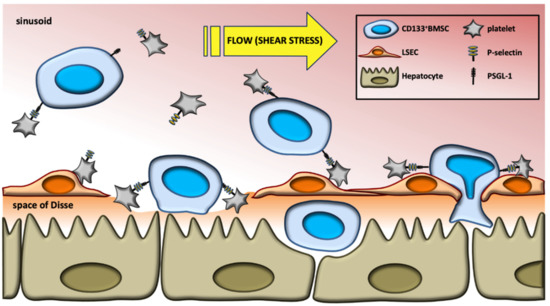 We have previously successfully applied human autologous CD133+HSC in a clinical scenario by intraportal administration following portal venous embolization of right liver segments to expand left lateral hepatic segments prior to extended liver resection [2,3,4]. Although the exact mechanisms by which extrahepatic stem cells and their progenitor cells promote liver regeneration are not fully elucidated [45,85,86], the liver proliferative effect of therapeutic stem cell applications in the clinical and pre-clinical scenarios of ischemia or hepatic volume loss may in part be due to local accumulation of administered BMSC prior to physiologically chemottractant-driven mobilization and homing. Our observations here provide a key mechanistic distinction to deepen our understanding of the proposed model of hepatic homing of CD133+BMSC subsequent to liver injury with platelets promoting sinusoidal adhesion and subsequent transmigration to the extra-sinusoidal space, both forwarded by P-selectin/PSGL-1 interaction (Figure 6). Alternatively, platelets may bind to the matrix of the space of Disse in areas of disturbed sinusoidal vascular disintegrity with subsequent promotion of CD133+BMSC accumulating to the space of Disse. Such platelet-space of Disse interactions were demonstrated for ischemia-reperfusion scenarios as observed subsequent to liver transplantation before (see [87,88]). Further studies on the diverse variants of hepatic damage need to be conducted in order to elucidate the exact mechanisms of platelets to support extravasation of homing CD133+BMSC to the liver.