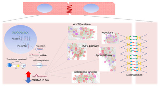 Schematic representation of miRNA maturation process, function and involvement in AC-related pathways.