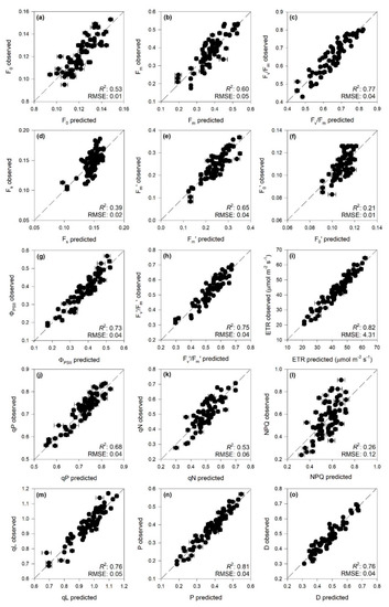Observed vs. partial least squares regression (PLSR)-predicted values of chlorophyll a fluorescence parameters in date palm leaves; error bars for predicted values represent the standard deviation generated from 500 simulated models; dashed line is 1:1 relationship; model goodness-fit (R2), and root mean square error (RMSE) for validation data generated using 80% of the data for calibration and 20% for validation are reported. Bias outputs are not shown as they were always lower than 0.01. (a) F0; (b) Fm; (c) Fv/Fm; (d) Fs; (e) Fm’; (f) F0′; (g) ΦPSII; (h) Fv’/Fm’; (i) ETR; (j) qP; (k) qN; (l) NPQ; (m) qL; (n) P; (o) D. See Table 1 caption for the parameter abbreviations.