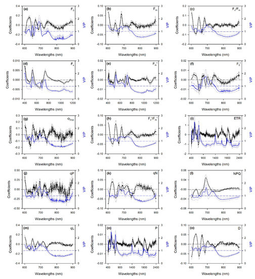 Mean (solid), 5th and 95th percentile (dotted) of standardized coefficients (black) and variable importance for projection (VIP, blue) by wavelengths for the PLSR models predicting chlorophyll a fluorescence parameters in date palm leaves. (a) F0; (b) Fm; (c) Fv/Fm; (d) Fs; (e) Fm’; (f) F0′; (g) ΦPSII; (h) Fv’/Fm’; (i) ETR; (j) qP; (k) qN; (l) NPQ; (m) qL; (n) P; (o) D. See Table 1 caption for parameter abbreviations.