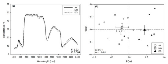 (a) Average foliar reflectance profiles of date palms exposed to ambient air (AA), moderate ozone (MO), and elevated ozone (EO); F- and P-values from permutational analysis of variance (PERMANOVA) for the effects of ozone on the full range (400–2400 nm) reflectance profiles of date palm leaves are reported in the bottom-right corner of the panel. (b) Scores (mean ± standard error) for the first and second principal components from principal coordinates analysis (PCoA) of the reflectance data (400–2400 nm) collected from date palm leaves, highlighting the capability of spectroscopy to discriminate plants exposed to AA (white circle) vs. plants exposed to MO (gray square) and EO (black triangle); average accuracy (Acc.) and Kappa (K) values from partial least squares discriminant analysis (PLS-DA) are reported on the bottom-left corner of the panel.