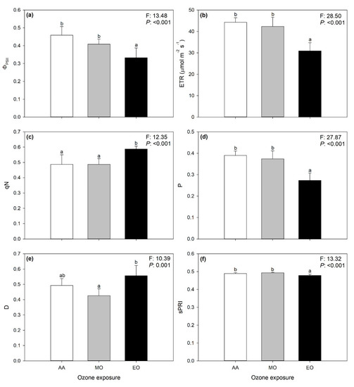 Variations of PSII operating efficiency in light conditions, ΦPSII (a); ETR, electron transport rate, ETR (b); non-photochemical quenching calculated as (Fm − Fm’)/(Fm − F0′), qN (c); fraction of light absorbed in PSII antennae that is utilized in PSII photochemistry, P (d); fraction of light absorbed in PSII antennae that is dissipated thermally, D (e); and (scaled) photosynthetic reflectance index, sPRI (f) estimated from spectra collected on leaves of date palm under ambient (AA, white), moderate (MO, gray) and elevate (EO, black) ozone concentrations. Data are shown as mean ± standard deviation. F- and p-values for the effects of ozone from a one-way ANOVA are shown in the top-right corner of panels. According to Tukey’s post-hoc test, different letters indicate significant differences among means (p: ≤0.05).
