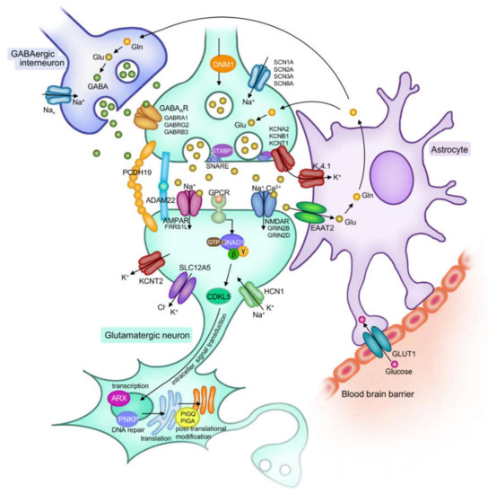 An epileptic seizure is defined as the transient occurrence of signs and/or symptoms due to abnormal excessive or synchronous neuronal activity in the brain. This excessive neuronal excitability can occur not only in the dysfunction of excitatory/inhibitory neurons but also in glial abnormalities [2,3]. Many pathophysiological processes have been described to cause monogenic epilepsies, including structural or functional changes in ion channels, neurotransmission, transporters, inter-neuronal connectivity, intra-neuronal signal transduction, transcription and translation/post translational modification (Figure 1, Table 1). Importantly, these pathologies can also cause neurological complications such as intellectual disability, neurodevelopmental disorders and psychiatric disorders.