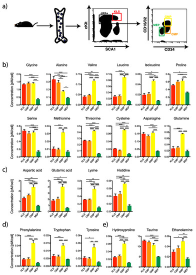 We then analyzed the cellular concentration of 25 different amino acids in HSPC populations using liquid chromatography-tandem mass spectrometry (LC-MS/MS) (Figure 1b–e and Figure 2b). In general, GMP and MEP, two populations derived from a common progenitor, namely CMP [32] had very different amino acid profiles. (Figure 1b–e). For most amino acids, the concentration was significantly higher in GMPs. Elevated amino acid content in GMPs reflects their faster proliferation rate as compared to other HSPCs [33], requiring substantial amounts of amino acids to gain cellular mass for cell-division [34].