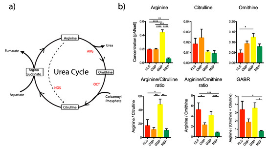 We also analyzed arginine metabolism and other intermediates of the urea cycle (Figure 2a), such as citrulline and ornithine, to ascertain their possible functional relevance in different HSPC populations, being important modulators of immune function [48,49]. Arginine was enriched in the GMP population (Figure 2b), similar to the pattern observed for essential amino acids. However, we found citrulline to tend to be enriched in KLS and CMP as compared to GMP (Figure 2b) while ornithine, another important intermediate in the urea cycle, had the opposite trend (Figure 2b).