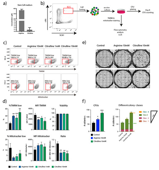 First, using LC-MS/MS, we measured the amount of arginine and citrulline in the stem cell media used in our standard ex vivo cultures and found the concentration of arginine and citrulline to be at ~375 µM and ~0.1 µM, respectively (Figure 3a). We sorted the KLS population using FACS and cultured them for three days at high concentrations of arginine and citrulline, 10 mM and 1–10 mM, respectively. At the end of the culture, the cells were stained with TMRM and Mitotracker green, allowing a readout both on ΔΨm and mitochondrial mass (Figure 3b). Both, arginine and citrulline, were able to expand the proportion of cells in the TMRM low gate (representative plots, Figure 3c), which correlated with a concomitant decrease of the mean fluorescence intensity (MFI) of both TMRM and mitotracker green (Figure 3d). Importantly, these data highlight the capacity of arginine and citrulline in reducing ΔΨm/mitochondrial activity, and thus, as we have previously demonstrated, possibly improving stem cell function [7,22]. Furthermore, we performed CFU assay of cells exposed to arginine and citrulline to access HSPC function (Figure 3e,f). Importantly, we confirmed, arginine and citrulline induced reduction in ΔΨm results in improvement in colony formation (Figure 3e,f). Moreover, we found a significant increase in class 3 and class 4 type of colonies (which are derived from most primitive HSPCs), in the treated conditions (Figure 3f).