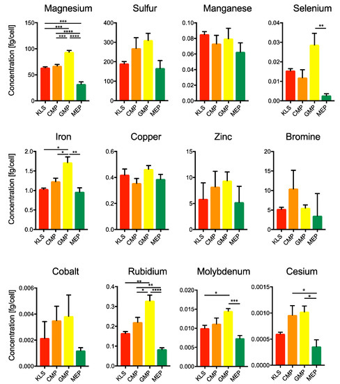 Estimation of minerals and trace elements in various bone marrow populations. Mineral analysis was performed on different bone marrow populations, as described in Figure 1. KLS: Lin−1cKit+Sca1+; CMP: Common Myeloid Progenitor; GMP: Granulocyte Macrophage Progenitor; MEP: Megakaryocyte Erythroid Progenitor. One-way ANOVA * p < 0.05, ** p < 0.01, *** p < 0.001, **** p < 0.0001 (n = 3).