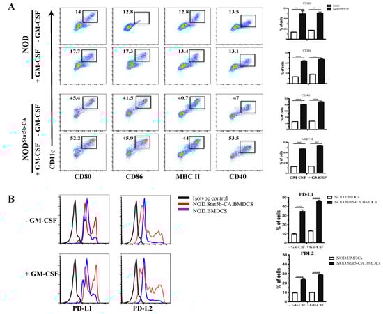 The capacity of DCs to promote immune tolerance or inflammatory immune responses is directly associated with their state of maturation. Several lines of evidence support the notion that mature DCs display the duality of APCs, being capable of linking innate and adaptive immunity or inducing immune tolerance to specific antigens. We have reported that LPS-activated splenic DCs of NOD.CD11cStat5b-CA mice displayed a mature phenotype and acquired tolerogenic DC signatures [9]. To further understand the molecular mechanisms underlying mature DC tolerogenic function, we used in vitro BMDCs generated by a combination of Granulocyte-Macrophage Colony-Stimulating Factor (GM-CSF) and IL-4, a condition that induces the generation of conventional DCs. To determine their maturation status, BMDCs were generated from 6- to 8-week-old NOD and NOD.CD11cStat5b-CA mice and cultured in the absence or presence of GM-CSF (50 ng/mL) for 48 h. Expression of co-stimulatory molecules was analyzed by flow cytometry (FACS). Results showed that unstimulated and GM-CSF-stimulated Stat5b-CA.BMDCs expressed high levels of MHC-II, CD80, CD86, and CD40 co-stimulatory molecules as compared to BMDCs of NOD mice (Figure 1A). Since tolerogenic DCs have been shown to promote central or peripheral tolerance through different mechanisms, including the expression of PD-L1 and PD-L2 [10,11], expression of these two immunomodulatory molecules was determined by FACS. Results showed that unstimulated CD11chigh Stat5b-CA.BMDCs expressed greater levels of PD-L1 and PD-L2 than BMDCs of NOD mice and were highly upregulated as a result of GM-CSF stimulation (Figure 1B). However, levels of PD-L1 and PD-L2 on CD11chigh BMDCs of NOD mice remained low, before and after GM-CSF stimulation (Figure 1B). These data were taken as evidence that CD11chigh Stat5b-CA.BMDCs expressed high levels of CD80, CD86, and MHC class II markers as compared to NOD BMDCs and that Stat5b-CA.BMDCs upregulated their expression of inhibitory molecules PD-L1 and PD-L2 following GM-CSF stimulation.