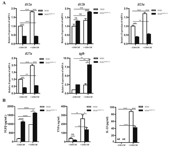 Cytokine profiles of BMDCs derived from NOD and NOD.CD11cStat5b-CA mice. BMDCs (1 × 105 cells/well) generated from NOD and NOD.CD11cStat5b-CA mice were cultured for 48 h in the absence or presence of GM-CSF (50 ng/mL). (A) Relative expression of Il12a, Il12b, Il23a, Il27a, and Tgfβ genes was determined by qPCR using the ΔΔCT method. qPCR data are shown as relative expression compared to untreated BMDCs of NOD mice. (B) Quantification of TGFβ, TNFα, and IL-23 released in the supernatants of BMDCs exposed or not to GM-CSF as determined by ELISA. Data are shown as the mean ± SEM of at least three independent experiments. The asterisks indicate statistically significant differences determined using one-way ANOVA with Tukey’s post-test. p < 0.05 (*), p < 0.01 (**), p < 0.001 (***), and p < 0.0001 (****). nd: not detected.