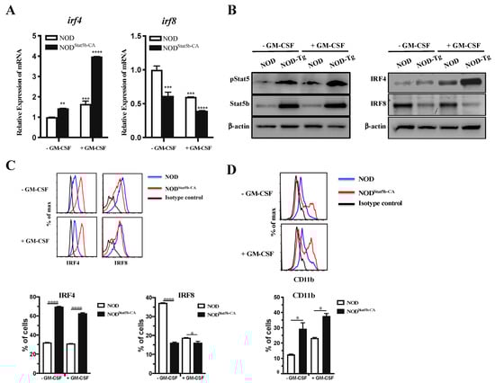IRF4 and IRF8 expression is differentially regulated in Stat5b-CA-expressing BMDCs. BMDCs derived from NOD and NOD.CD11cStat5b-CA mice were cultured for 48 h in the absence or presence of GM-CSF (50 ng/mL). (A) Irf4 and Irf8 mRNA expression levels were determined by qRT-PCR using the ΔΔCT method. The data are shown as relative expression compared to untreated BMDCs derived from NOD mice. (B) Representative Western blot analysis of IRF4, IRF8, pStat5, and Stat5b expression. β-actin expression is shown as a gel-loading control. (C–D) Representative flow cytometry analysis of (C) IRF4 and IRF8, and (D) CD11b in CD11c+ BMDCs. Data are shown as the mean ± SEM of at least three independent experiments. The asterisks indicate statistically significant differences determined by one-way ANOVA with Tukey’s post-test. p < 0.05 (*), p < 0.01 (**), p < 0.001 (***), and p < 0.0001 (****).