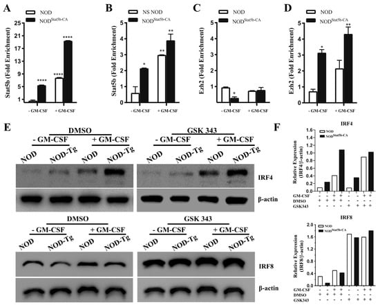 The molecular mechanisms by which Stat5b-CA regulates expression of IRF4 and IRF8 in BMDCs and, consequently, their immunogenic as opposed to tolerogenic function remain to be established. The optimal binding motif for Stat5 has been defined as the GAS motif TTCN3GAA. While the dimeric form of Stat5 binds strongly to the GAS canonical motif, the tetrameric form of Stat5 binds to two GAS motifs [20]. Database analysis of IRF4- and IRF8-encoding genes has revealed that the Irf8 gene contains two GAS motifs upstream of the 5′ end, whereas the Irf4 gene contains only one GAS motif in that region. In addition, it has been reported that tetrameric Stat5 binding to the intronic Igκ enhancer Eκi, which recruits Ezh2, results in the repression of Igκ germline transcription during B cell lymphopoiesis [21]. To investigate whether Stat5b recruited Ezh2 to bind single or double GAS motifs upstream of the Irf4 and the Irf8 genes, respectively, we performed quantitative chromatin immunoprecipitation (ChIP) experiments using antibodies directed against Stat5b or Ezh2, followed by PCR amplification using primers specific for Irf4 and Irf8. Results showed that Stat5b bound to the promoter of Irf4 and to the enhancer of Irf8 in Stat5b-CA.BMDCs and NOD BMDCs (Figure 5). However, DNA binding of Stat5b to the promoter of Irf4 (Figure 5A) and Irf8 (Figure 5B) was significantly increased in Stat5b-CA.BMDCs with respect to NOD BMDCs. The consequences of Stat5-mediated gene repression or activation vary depending on the context in which Stat5 binding occurs. We thus investigated whether Stat5-CA recruited Ezh2 to the GAS motifs of Irf4 and Irf8 upstream sequence. Results showed that the pull-down of Ezh2 resulted in the enrichment and the amplification of the irf8 gene (Figure 5D), whereas no irf4 gene amplification was detectable (Figure 5C). These results suggest that Ezh2 was not recruited to the Irf4 promoter, whereas it was recruited to DNA fragments corresponding to the enhancer of Irf8. To confirm whether concomitant recruitment of Ezh2 and Stat5-CA to GAS sequences in the Irf8 enhancer in Stat5-CA.BMDCs contributed to IRF8 repression, Stat5b-CA.BMDCs and NOD BMDCs were pre-incubated with the selective Ezh2 inhibitor GSK343. DCs were left unstimulated or were exposed to GM-CSF, and IRF8 and IRF4 expression was determined by Western blot. Results showed higher levels of IRF4 expression in Stat5b-CA.BMDCs than in NOD BMDCs, whereas IRF8 expression was lower in NOD BMDCs than in Stat5b-CA.DCs (Figure 5E,F). However, treatment with Ezh2 inhibitor GSK343 enhanced the expression of IRF8 in Stat5b-CA.DCs as well as in NOD BMDCs (Figure 5E,F). Interestingly, levels of IRF4 remained higher in Stat5b-CA.BMDCs as compared to NOD BMDCs (Figure 5E,F). These observations suggested that Ezh2 recruitment played a determining role in reducing IRF8 gene transcription but not in regulating IRF4 gene expression (Figure 5E). Altogether, these results suggested that active Stat5b recruited Ezh2 to bind to the IRF8 enhancer and repressed its transcription. Consequently, the absence of Ezh2 recruitment with Stat5b to the IRF4 promoter released IRF4 transcription in tolerogenic Stat5b-CA.BMDCs.