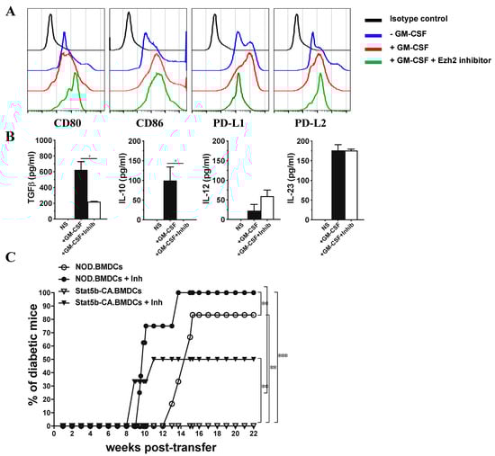 Inhibition of Ezh2 in Stat5b-CA-expressing BMDCs disturbs their tolerogenic signature and their capacity to protect against diabetes in NOD mice. (A,B) Stat5b-CA.BMDCs were pre-incubated for 1 h with the Ezh2 inhibitor GSK343 (3 µM) or vehicle (0.1% DMSO), then cultured for 48 h in the absence or presence of GM-CSF (50 ng/mL) and analyzed for (A) the expression of CD80, CD86, PD-L1, and PD-L2 by FACS and (B) production of cytokines (TGFβ, IL-10, IL-12, and IL-23) by ELISA. (C) BMDCs derived from NOD or NOD.CD11cStat5b-CA mice were cultured in vitro with Ezh2 inhibitor GSK343 (3 µM) or vehicle (0.1% DMSO). DCs were washed and i.v. injected (107 cells/mouse) to 8-week-old female NOD mice (6 mice per group). Recipient NOD mice were followed for diabetes development until 26 weeks (22 weeks post-injection) of age. The asterisks indicate statistically significant differences determined by one-way ANOVA with Tukey’s post-test. p < 0.05 (*). For diabetes development, data were analyzed by Gehan–Breslow–Wilcoxon test. p < 0.01 (**) and p < 0.001 (***).