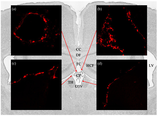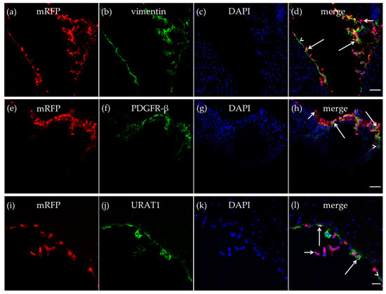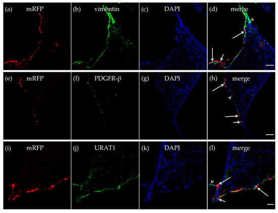 The mRFP-HCA1 labeling was particularly strong in the tela choroidea. The meningeal pia mater, which contributes to form the tela choroidea [14,15], contains a thin sheet of flattened fibroblasts. These pial fibroblasts secrete vimentin [34]. As described in the CP, we also detected vimentin-positive cells in the tela choroidea in the roof of the dorsal part of the third ventricle, and most of the vimentin-positive cells expressed mRFP-HCA1 (Figure 4a–d). We also detected mRFP-HCA1 in PDGFR-β positive cells in the tela choroidea (Figure 4e–h). Ependymal cells also contribute to form the tela choroidea [14,15]. The co-labeling with the ependymal cell marker URAT1 and mRFP-HCA1 showed an overlapping labeling pattern with the two antibodies, suggesting co-localization in the same cells. This was observed in the tela choroidea in the roof of the dorsal part of the third ventricle (Figure 4i–l).