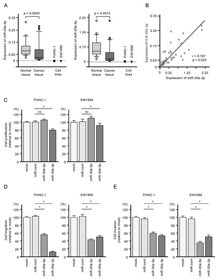 Tumor-suppressive functions of miR-30a-5p and miR-30a-3p in pancreatic ductal adenocarcinoma (PDAC) cells. (A) Expression levels of miR-30a-5p and miR-30a-3p in PDAC clinical specimens and cell lines (PANC-1 and SW1990). Data were normalized relative to the expression of RNU48. (B) Pearson’s coefficient showed positive correlations between the expression levels of miR-30a-5p and miR-30a-3p in clinical specimens. (C) Cell proliferation assessed using XTT assays. Data were collected 72 h after miRNA transfection (* p < 0.0001). (D) Cell migration assessed with a membrane culture system. Data were collected 48 h after seeding the cells into the chambers (* p < 0.0001). (E) Cell invasion determined using Matrigel invasion assays conducted 48 h after the seeding of the miRNA-transfected cells into the chambers (* p < 0.0001).