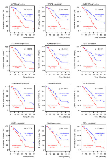Multivariate analysis revealed that expression levels of 10 genes (EPS8, HMGA2, ENDOD1, SLC39A10, TGM2, MGLL, SERPINE1, ITGA2, DTL and UAUC) were independent prognostic factors for 5-year overall survival after adjustment for tumor stage, lymph node metastasis, and pathological stage (p < 0.01).