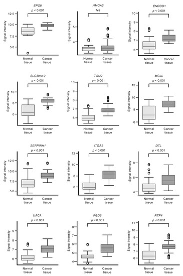 Among the 102 genes, expression levels of 12 genes (EPS8, HMGA2, ENDOD1, SLC39A10, TGM2, MGLL, SERPINE1, ITGA2, DTL, UACA, FGD6, and RTP4) had significant impacts on the prognosis of PDAC patients (Figure 2; p < 0.01). We validated the expression levels of these 12 genes and found that, except for HMGA2, all had upregulated expressions in PDAC clinical specimens (Figure 3).