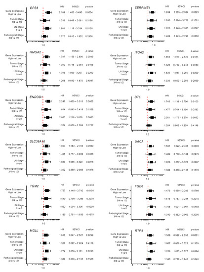 Moreover, expression levels of 10 genes (EPS8, HMGA2, ENDOD1, SLC39A10, TGM, MGLL, SERPINE1, ITGA2, DTL, and UACA) were identified as independent prognostic factors in multivariate analyses for the survival of patients with PDAC (p < 0.01; Figure 4). In advance to the multivariate analysis, the following factors were selected, and a univariable analysis was performed: age, gender, tumor stage, LN stage, metastatic stage, pathological stage, tumor size, and alcohol history. Among these factors, the tumor stage, LN stage, and pathological stage affected the prognosis of the PDAC patients. From this result, we performed the multivariate analysis with the following four factors: tumor stage, LN stage, pathological stage, and gene expression.