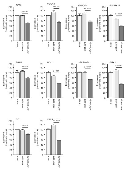 We investigated whether expression levels of these 10 target genes would be suppressed by the transfection of PDAC cells with miR-30a-3p. After transfection of the PDAC cell line PANC-1 with miR-30a-3p, the expression levels of all 10 of these genes were reduced (Figure 5).