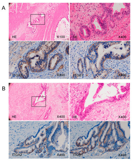 Using immunohistochemistry, we confirmed the expression of the ITGA2 and ITGB1 proteins, binding partner of ITGA2, in clinical specimens from patients with PDAC. Overexpression of both ITGA2 and ITGB1 was detected in these cancer lesions (Figure 9).