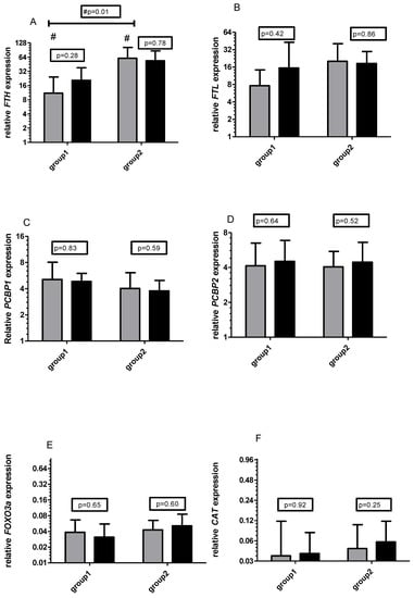 Changes in relative expression (2^) of FTH (A), FTL (B), PCBP1 (C), PCBP2 (D), FOXO3a (E), and CAT (F) before (grey bars) and after 6 weeks (dark bars) unsupplemented training period. # significant differences between groups. All mRNA expressed as 2^ relative expression/TUBB.