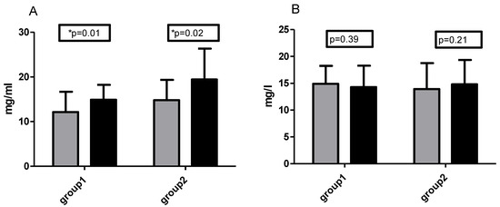 The volunteers in group 1 had a mean basal vitamin C plasma concentration of 12.2 mg/L, while those in group 2 had a mean concentration of 14.8 mg/L. All participants had basal vitamin C concentrations within the physiologically normal range (6–20 mg/L). After six weeks of training with supplementation, the vitamin C plasma concentration in both groups increased significantly (in group 1 mean value changed from 12.2 to 14.9 mg/L and in group 2 from 14.8 to 19.5 mg/L, p = 0.03). Six weeks of training without vitamin C supplementation did not affect the plasma concentration of vitamin C. There were no significant differences between groups in the plasma vitamin C concentrations during the whole experiment (Figure 3A,B).