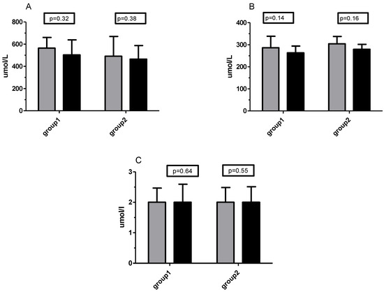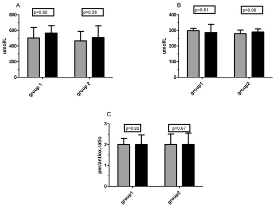 High levels of total oxidative status were maintained throughout the study in both groups (≥350 umol/L for plasma). Little change in TOS was noted during the experiment, although the mean values after supplementation were slightly higher in both groups (for Group 2 the increase was from 465 to 509 umol/L, Figure 4A). In the supplementation period, TAS/TAC status, as well as prooxidative/antioxidative ratio, remained unchanged (Figure 4B,C). The TAS level in participants was around the average or less of the physiological norm.