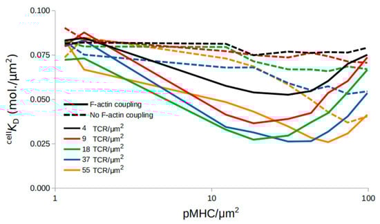 Interestingly, arrest of F-actin coupling resulted in a different qualitative behavior (Figure 3) than seen before (Figure 2). pMHC as well as TCR titration resulted in constant or, in some cases where TCR ≥ 37/µm2, slowly decreasing cell KD (Figure S1). Even in the cases of decreasing cell KD, no minimum emerged. Therefore, as the model predicts, further experiments should be performed with F-actin actin arc formation inhibition [8,9,42] to investigate whether the centrally directed motion of TCR–pMHC complexes indeed supports TCR cooperativity and promotes the transition from decreasing to increasing cell KD. This behavior may be considered a transition from positive to negative feedback on TCR affinity [11]. Taken together, these results suggest that the centripetal transport of complexes due to interactions with the F-actin flow could plausibly account for TCR affinity modulation.