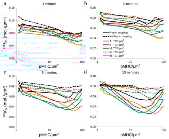 However, at later time points, from 2–10 min, as the pMHC density increased, cell KD decreased, reached a minimum value, and then increased again, recalling Figure 2. This behavior was not observed when actin coupling of molecules underwent arrest (Figure 3). Together, these results showed that the time point of affinity measurement is important, allowing for clear indication of TCR affinity modulation around 5 min after initiation of immune synapse formation. The model is in accordance with experimental findings, which suggests that peak cooperativity is achieved 4–8 min after the first observed binding event [12].