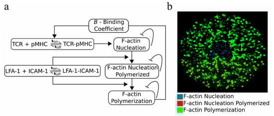 Although the results already suggested that the centrally directed motion of TCR–pMHC complexes is a potential mechanism for TCR affinity modulation, we further investigated if active modulation of the association rate, kon, could produce the same results. According to the experimental findings, the dissociation rate, koff, remained unaffected. A possible mechanism suggested in the literature implicates the F-actin foci, which assist in TCR activation and signaling [25]. F-actin foci are dynamically polymerized structures resulting from local nucleation of F-actin and appear at TCR–pMHC sites [25,26]. We have developed an F-actin foci model (Figure 5a), where the presence of TCR–pMHC and LFA-1–CAM-1 can eventually lead to F-actin foci formation (Figure 5b; F-actin polymerization; green clusters), which in turn can affect the binding probability of TCR–pMHC complexes via a binding coefficient, B (Figure 5a). A detailed explanation of the model can be found in Section 4. Material and Methods.